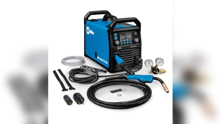 The Millermatic 211 PRO MIG Welder is a portable and versatile welding machine from Miller designed to handle various metals including mild steel, stainless steel, and aluminum when paired with a spool gun. It features user-friendly technology such as Auto-Set for quick setup and smooth-start for cleaner arcs, making it suitable for a wide range of welding projects whether you’re working on a hobby or professional job site.